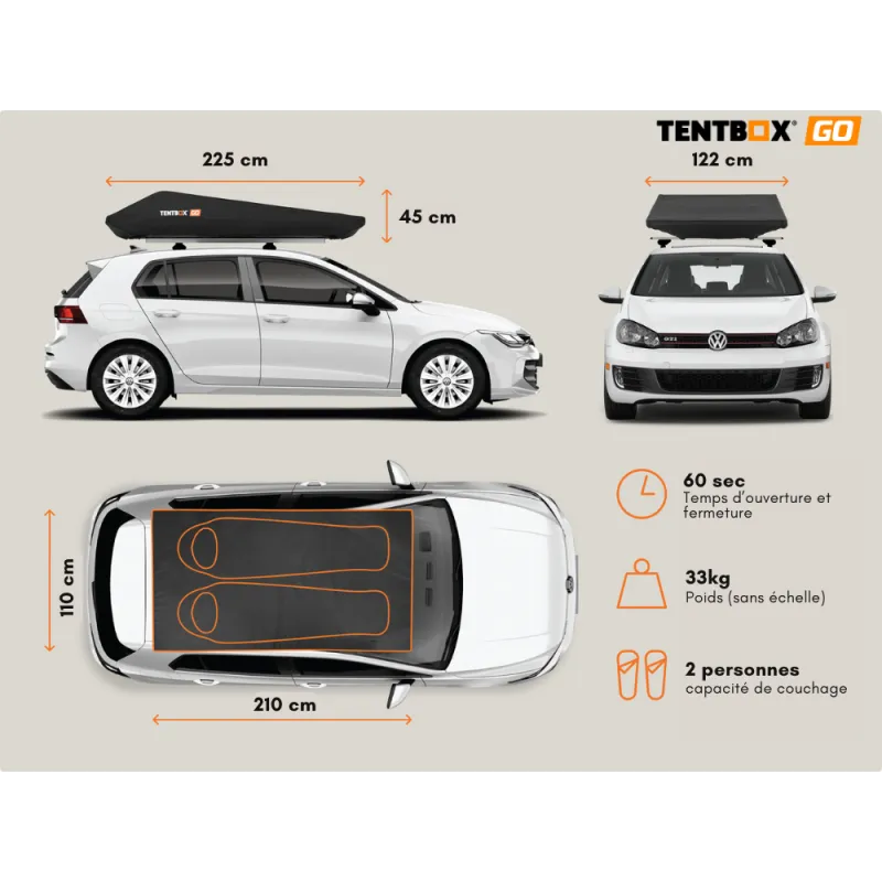 Malgré sa taille réduite, la Tentbox Go offre un vrai confort de couchage et une excellente résistance aux intempéries. Parfaite pour les escapades à deux, les week-ends nature ou les road trips improvisés. Son faible poids lui permet d’être montée sur des barres de toit standard, tout en garantissant une excellente stabilité une fois déployée.